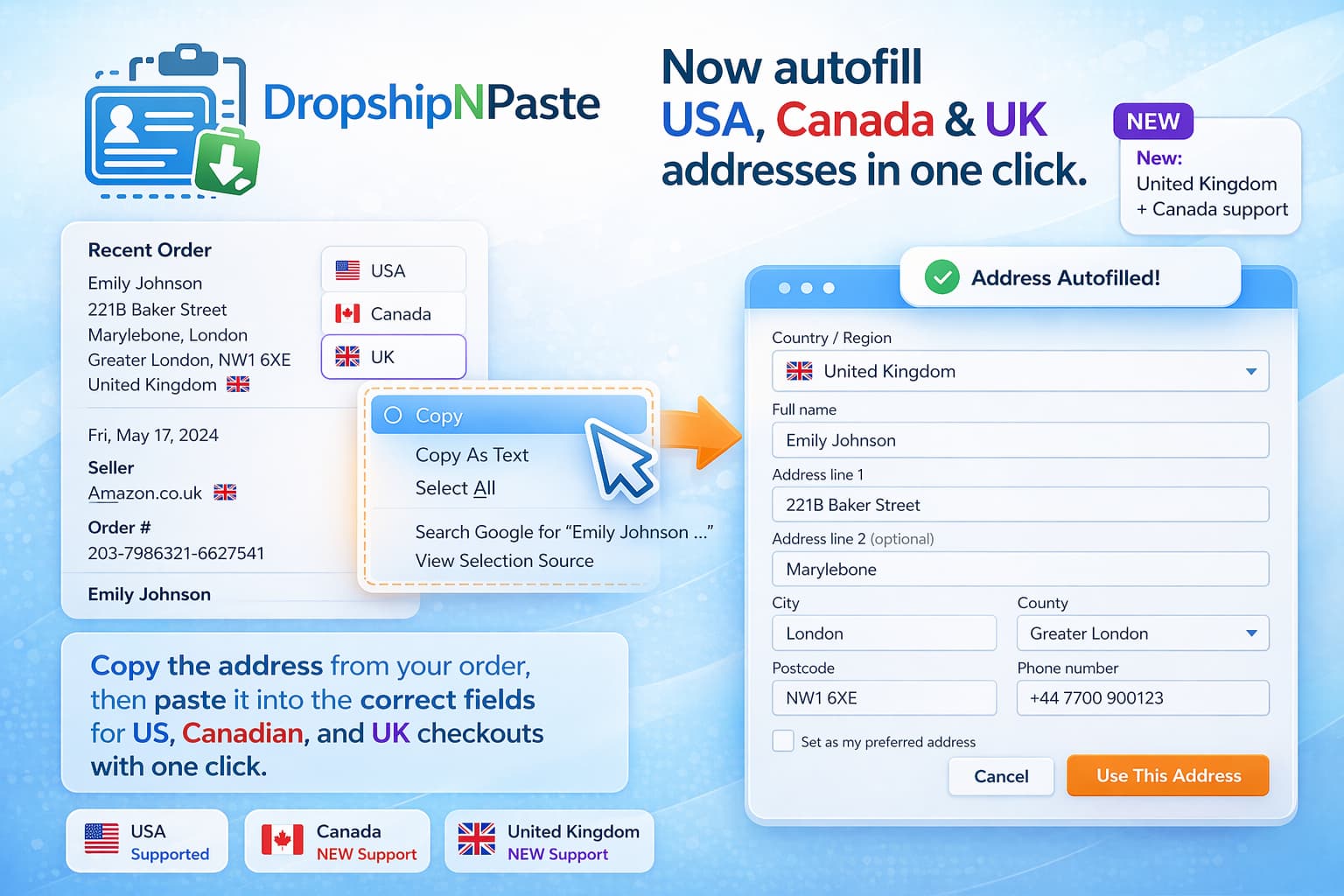 We’ve spent countless hours completely redesigning and rebuilding DropShip N Paste from the ground up for 2026. Every line of code has been rewritten, every feature rebuilt, and every interaction refined to deliver the fastest, most reliable, and most intuitive dropshipping address filler experience ever created. With enhanced built-in compatibility across 80+ suppliers, universal support across 1000’s of other sites, brand-new autofill support for Canadian and United Kingdom shipping addresses, and a sleek new interface, Version 3.2 represents everything we’ve learned from years of feedback distilled into one powerful extension. This is better than ever.